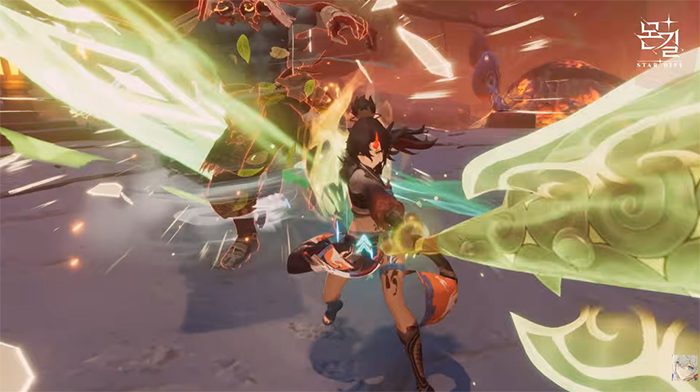 이번 영상의 백미는 언리얼 엔진 5를 활용한 화려한 연출과 세밀한 그래픽으로 표현해낸 묵직한 액션이다. '가비'가 방망이를 크게 휘두르거나 지면을 강하게 내리칠 때 발생하는 화려한 빛의 이펙트와 역동적인 카메라 워킹은 전투의 타격감을 시각적으로 극대화했다. 또한, 도깨비라는 콘셉트에 걸맞게 녹색과 황금색이 어우러진 강렬한 효과를 배치하여 캐릭터 고유의 분위기를 완성도 있게 그려냈다.