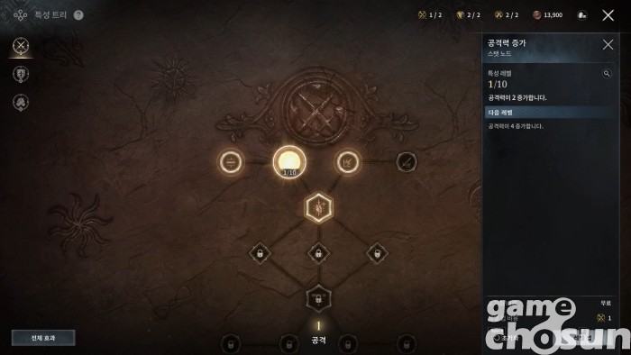 캐릭터 성장은 레벨업에 따른 스킬 습득과 특성 분배, 장비 파밍 등 다양한 방식이 제공된다. 그중에서 특성은 공격력 증가나 방어력 증가 같은 기본적인 능력치 증가부터 치명타 성공 시 치명타 피해량 증가 같은 추가 효과까지 플레이 방향성을 결정하는 요소다.