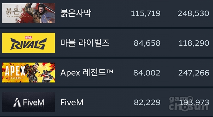지난 20일 출시된 붉은사막은 출시 첫날 스팀 동시 접속 239,045를 기록하며 단숨에 10위권 내에 진입했다. 이후 주말을 기점으로 동시 접속 수 248,530을 달성하며 기록을 경신했고, 평일에도 11만 명 전후를 오가며 5위권을 유지 중이다.