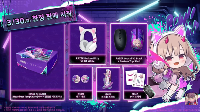 오는 3월 30일 오전 10시 네이버 레이저 공식 스토어를 통해 판매가 시작되는 '「승리의 여신: 니케」 x 「RAZER」[Heartbeat Temptation] 바이퍼 한정판 기프트 박스'는 레이저의 대표적인 게이밍 기어에 니케의 아이덴티티를 녹여낸 특별한 구성을 선보인다.
