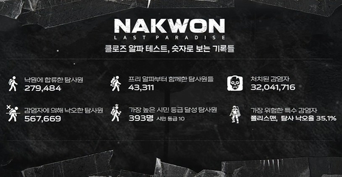 이번 클로즈 알파 테스트에는 총 279,484명의 탐사원이 참여했으며, 이 중 43,311명은 프리 알파 테스트에 참여했던 이용자로 다시 한 번 ‘낙원’에 발을 들였다. 이용자들은 5일간 무려 32,041,716 마리의 감염자를 처치했으며, 이는, 탐사원 1인당 평균 115 마리의 감염자를 쓰러뜨린 셈이다.