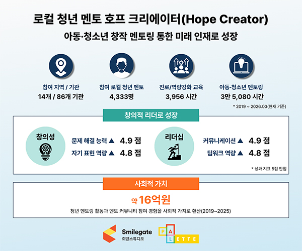 [자료제공 = 스마일게이트] 미래세대에게 희망을 확산하는 스마일게이트 희망스튜디오(이하 희망스튜디오, 이사장 권혁빈)는 창의 커뮤니티 ‘팔레트(PALETTE)’의 청년 멘토 ‘호프 크리에이터(Hope Creator) 6기’가 활동을 마쳤다고 27일 밝혔다.