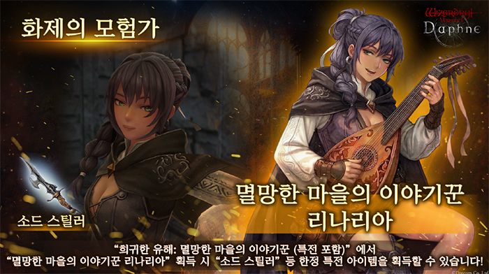 [자료제공 = 드리콤] 드리콤(대표 나이토 히로키)은 자사의 3D 던전 RPG ‘위저드리 배리언트 다프네(Wizardry Variants Daphne)’에서 새로운 전설급 모험가 ‘멸망한 마을의 이야기꾼 리나리아’를 추가하고, 이를 기념하는 다채로운 캠페인을 3월 27일부터 개최한다고 밝혔다.