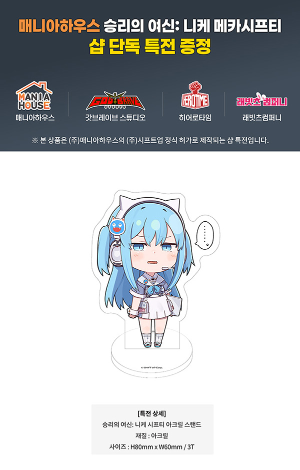 '메카미 시프티'와 함께 이번에도 활약한 작년 만우절 이벤트의 주인공 '메카 시프티'의 실제 피규어도 공개됐다. 한국 메카 프라모델 설계의 최전선 '갓브레이브 스튜디오'와의 협업으로 완성된 이번 '승리의 여신: 니케 "메카 시프티" 조립 완성형 프라모델'은 피규어 샵 '매니아하우스'를 통해 예약을 진행할 수 있다.