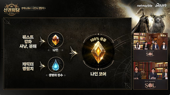 이번 방송에서 가장 화제가 된 부분은 '나인'의 직접 획득 외에도 이용자의 시간과 노력이 담긴 '경험치'가 실질적인 재화로 변환된다는 점이다. 플레이를 통해 쌓인 경험치는 '생명의 정수'라는 아이템으로 치환되며 이를 나인과 결합하면 거래소에서 유통할 수 있는 '나인 코어'가 제작된다.