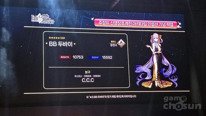 이어서 5성 문캔서 BB 두바이, 4성 문캔서 테노치티틀란, 4성 포리너 수수께끼의 히로인 XX가 4월 22일부터 6월 3일까지 진행되는 주장III '신영장후계저 아키타입 인셉션' 기념 픽업으로 추가된다. 한국 서버 추가를 기념해 BB 두바이 담당 성우 츠타야 노리코가 한국 마스터들에게 인사를 전했다.