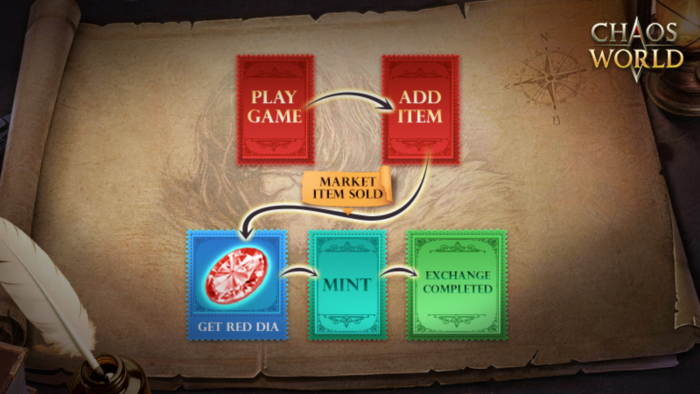 카오스W의 경제 생태계는 핵심 재화인 '레드 다이아몬드'를 중심으로 운영된다. 레드 다이아몬드는 게임 플레이를 통해 획득한 아이템을 거래소에서 판매하여 얻을 수 있으며, 획득한 레드 다이아몬드는 게임 내 아이템 구매에 사용하거나 카오스W의 게임토큰으로 전환할 수 있다. 아울러 레드 다이아몬드의 총 공급량을 10억 개로 고정해 재화의 안정성을 유지하기 위한 정책도 도입된다.