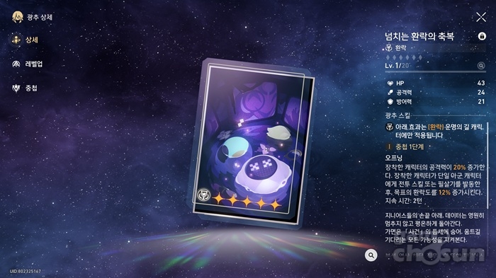 이전과 같이 개척 임무 및 지역 재료 수집 현황에 따라 획득 및 돌파가 가능할 것으로 추정되며 최근 라이브 서버 4.1버전에서 추가된 헤르타 상점 광추 '넘치는 환락의 축복'이 공격력 및 아군의 환락도 관련 옵션을 가지고 있는 서포터용 광추로 확인되고 있어 환락 개척자도 공격력 관련 기재를 중심으로 가동되는 서포터일 가능성이 높다.