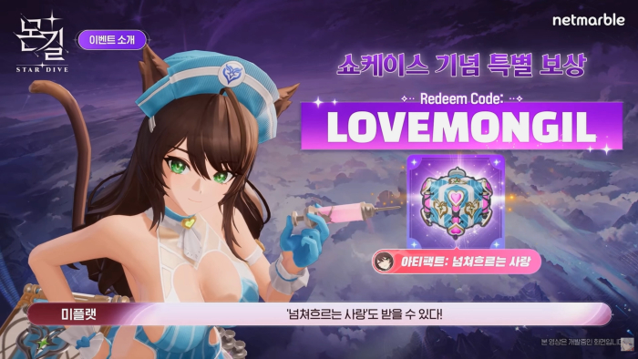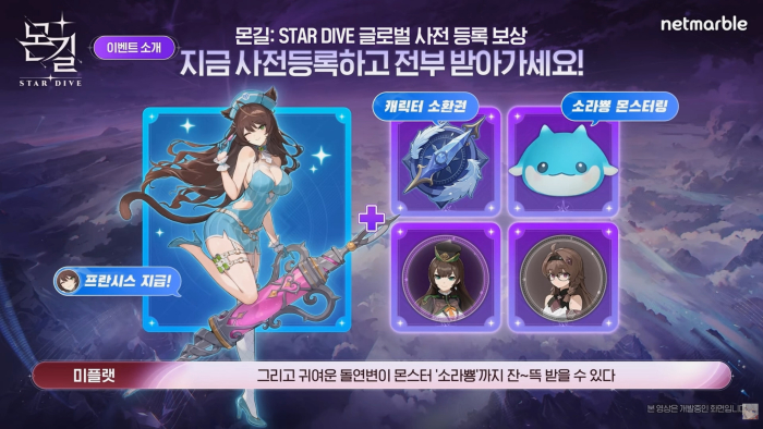 넷마블은 몬길: 스타 다이브 출시를 기념해 수인족 힐러 프란시스와 전용 아티팩트, 캐릭터 소환권, 소라뿅 몬스터링 등을 사전 예약 보상으로 제공한다. 또한 게임에 접속하면 뽑기권과 픽업 뽑기권을 선물로 증정한다.