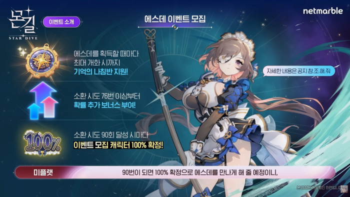 몬길: 스타 다이브 첫 픽업 캐릭터는 메이드 캐릭터인 에스데다. 픽업 캐릭터는 이벤트 소환 90회 달성 시 100% 확정 획득할 수 있다. 이와 함께 에스데의 이야기를 엿볼 수 있는 어서오세요 메이드와 토끼풀에 이벤트가 진행된다.