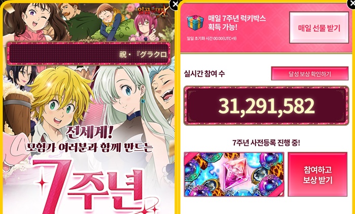 특설 페이지에서는 '7주년 럭키박스'를 매일 획득 가능할 뿐만 아니라, 사전등록도 진행할 수 있다. 7주년 럭키박스에서는 8종의 보상 중 하나를 매일 지급받을 수 있으며 주요 보상 구성은 다음과 같다.