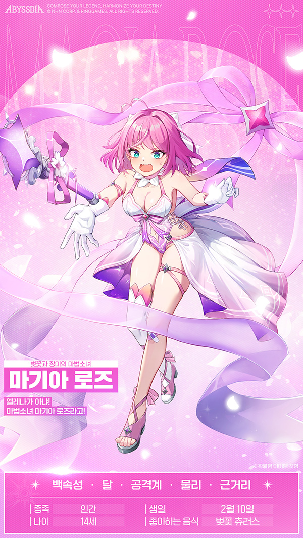 '마기아 로즈'는 봄에 걸맞은 벚꽃 감성, 마법소녀 콘셉트의 캐릭터로 등장해 기존 '엘레나'와는 차별화된 매력을 선보인다. '백속성'이자 '달' 표식, '근거리', '물리 공격'형 뱅가드로 구현되었으며 벚꽃 츄러스를 좋아하는 귀여운 설정과 핑크색 화사한 비주얼이 특징이다.
