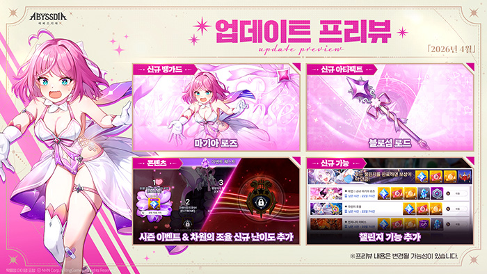 NHN가 서비스하고, 링게임즈가 개발한 체인 액션 RPG '어비스디아'가 오는 4월 16일 진행될 업데이트를 앞두고 신규 뱅가드 '마기아 로즈'의 상세 정보와 같은 날 진행될 업데이트 프리뷰를 공개했다. 특히 이번 신규 캐릭터는 기존 이용자들에게 친숙한 SR 등급 뱅가드인 '엘레나'의 첫 번째 이격 캐릭터라는 점이 눈에 띈다.