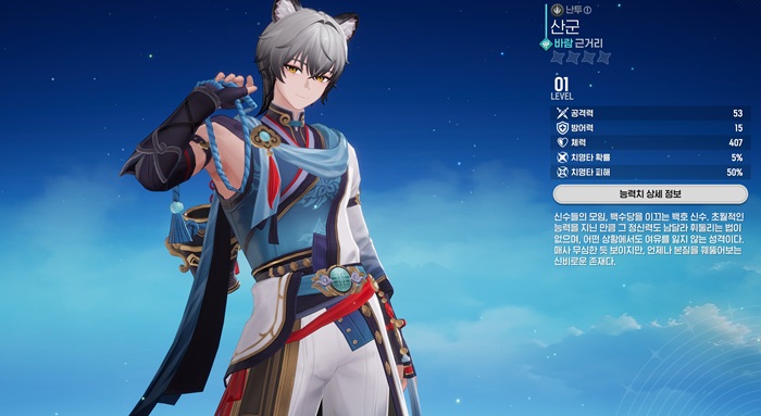네 번째로 만나보는 캐릭터는 보스전에 특화된 반격 전용 바람 속성 영웅 '산군'입니다.