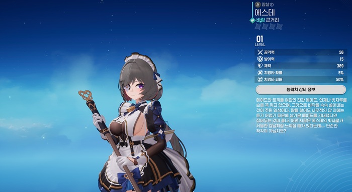암살 클래스인 만큼, 그에 어울리는 능력도 보유했습니다. 선택된 팀원 캐릭터가 전투에 돌입하면 잠복 상태로 등장해 함께 싸우면서 적에게 피해를 줄 수 있습니다. 이처럼 에스데는 필드 전투에서 다수의 적을 정리할 수 있는 자원임과 더불어, 보스전에서도 속성에 상관없이 서포트가 가능한 다재다능한 캐릭터인 셈입니다.