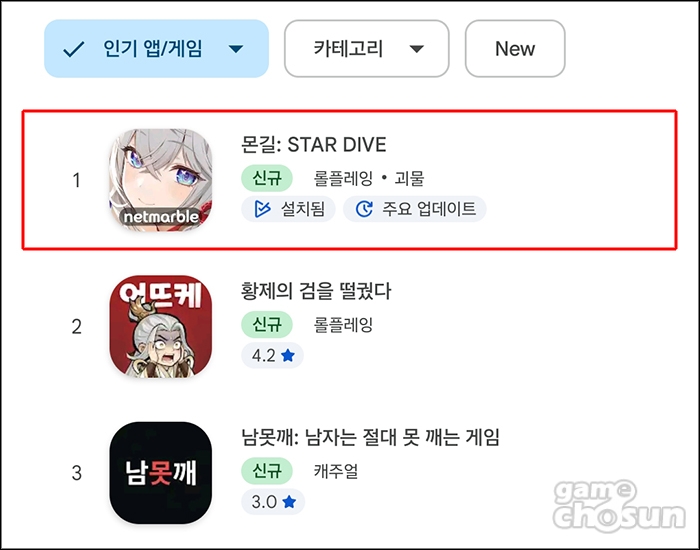 넷마블의 신작 '몬길: 스타 다이브'가 구글 플레이스토어 인기 1위를 달성했다.
