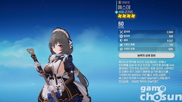 앞서 말한 것처럼 에스데는 바람 속성 암살 캐릭터다. 설명 상 표기는 근거리 캐릭터지만, 특수 스킬을 사용해 연막 안으로 들어가면 공격 범위가 늘어나 사실 상 원거리 캐릭터처럼 사용할 수 있다. 메인 퀘스트를 진행할 땐 적들이 넓게 퍼져있어 적을 따라다녀야하는 근거리 캐릭터보다 적은 움직임으로 쉽게 공격할 수 있는 원거리 캐릭터가 유리한데 에스데는 범위까지 넓어 마치 불도저처럼 퀘스트를 밀어버린다.
