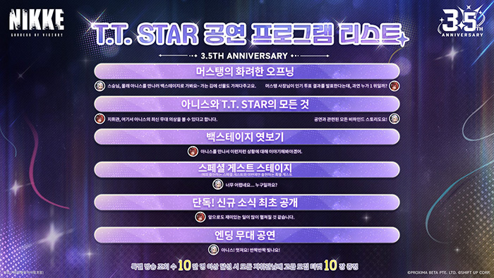 앞서 15일 공개된 3.5주년 티저 영상은 설렘 가득한 OST와 함께 무대를 준비하는 'T.T. STAR' 멤버들의 화려한 모습을 담아내며 기대감을 자아냈습니다. 그간 메인 챕터에서 노력해왔던 모습들, 또, 직전 사이드 스토리 'PRETTY STAR'에서 보여준 '프리티'와 '아니스'의 과거와 연결되는 이번 서사는 단순한 캐릭터 추가를 넘어 니케 특유의 몰입감 있는 스토리를 다시 한번 선사할 것으로 보입니다.