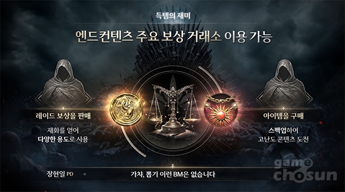 또, 엔드 콘텐츠의 주요 보상은 거래소 이용이 가능하도록 하여 레이드 보상을 판매하여 재화를 얻어 다양한 용도로 사용하거나, 아이템 구매를 통해 스펙업하여 고난도 콘텐츠에 도전하는 등 득템의 재미를 살렸다.