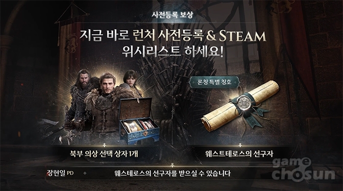 넷마블은 쇼케이스 당일부터 오는 24일까지 스팀 비공개 테스트를 진행하며 이를 통해 수집된 피드백을 바탕으로 게임의 완성도를 높일 계획이다. 사전 이벤트 로드맵과 함께 정식 론칭일도 공개됐다. 5월 14일 PC 선 공개 이후 5월 21일 그랜드 론칭을 확정했다. 현재 진행 중인 런처 사전 등록 및 스팀 위시리스트 참여자에게는 북부 의상 선택 상자와 웨스테로스의 선구자 칭호를 보상으로 지급된다.