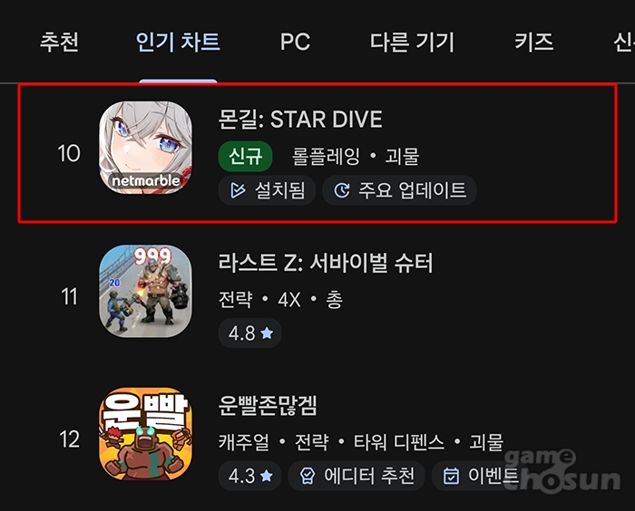 넷마블의 신작 '몬길: 스타 다이브'가 구글 플레이스토어 매출 10위권에 진입했다.