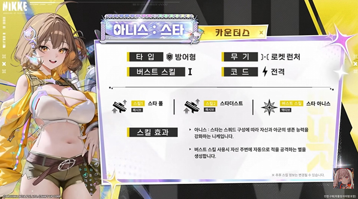 자신의 우상을 강화하는 지원형 니케로, 버스트 스킬 사용 시 자신의 생존 능력을 강화합니다. 배포 니케 특성상 성능상으로는 아쉬울 수 있지만 자신의 우상, 즉, '아니스: 스타' 한정으로 강력한 버프 성능을 발휘하는 형태의 극단적인 모습을 보여줄 가능성도 있어 보입니다.