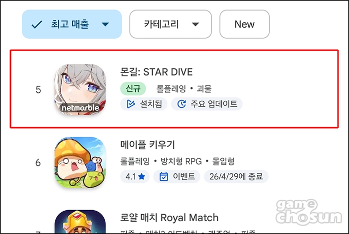 넷마블의 신작 '몬길: 스타 다이브'가 구글 플레이스토어 매출 5위를 달성했다.