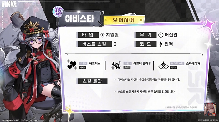 자신의 우상을 강화하는 지원형 니케로, 버스트 스킬 사용 시 자신의 생존 능력을 강화합니다. 배포 니케 특성상 성능상으로는 아쉬울 수 있지만 버퍼이자 힐러로서 치우친 성능을 발휘하는 형태일 수 있겠습니다. 함께 공개된 스킬 명칭은 '애프터 쇼', '애프터 글러우', '스타게이저'입니다.