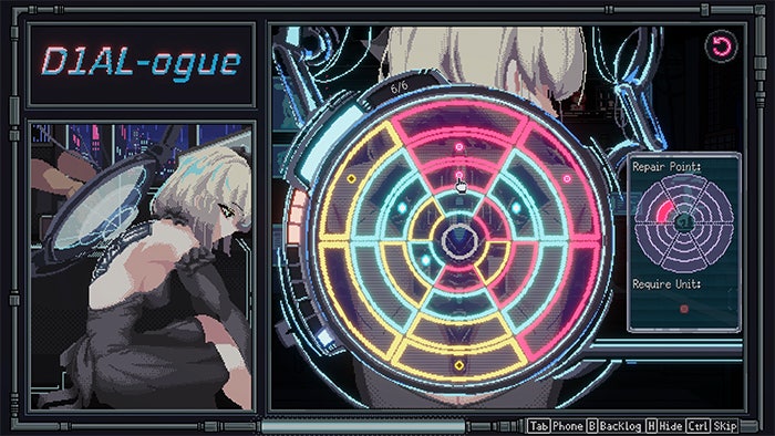 게임의 구조는 지극히 단순합니다. 가게를 방문하는 손님들과 대화를 하거나 그들의 의뢰를 받아 이브의 소체나 부품을 손보는 것이죠. 대화는 2D 일러스트와 대화창을 조합한 전통적인 비주얼 노벨 방식을 택했으며, 수리는 매치 3 퍼즐에 기반한 원형 퍼즐 방식을 제공합니다. 원형 퍼즐은 언뜻 보기에 다소 복잡해 보이지만, 원리를 이해하고 나면 매치 3 퍼즐답게 쉽고 간단하게 풀 수 있습니다.