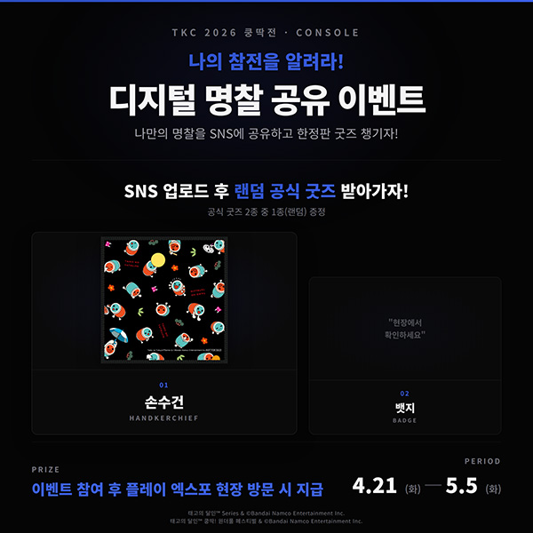 온라인 예선 신청자를 위한 특별 이벤트도 마련됐다. 예선 신청 후 메일로 발송되는 ‘나만의 디지털 명찰’ 이미지와 각오를 필수 해시태그와 함께 SNS에 업로드하면 참여가 완료된다. 이벤트 참여자에게는 결선 현장 인증 시 ‘태고의 달인’ 한정 굿즈 2종 중 1종을 무작위로 증정한다.