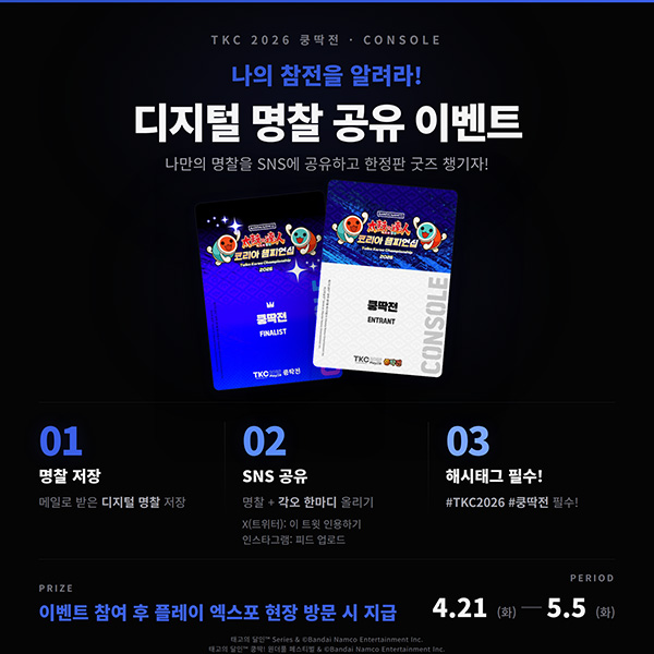 대회 참가 신청 방법 및 촬영 규정 등 자세한 정보는 ‘태고의 달인 코리아 챔피언십 2026 쿵딱전’ 공식 홈페이지와 반다이남코 엔터테인먼트 코리아 공식 채널을 통해 확인할 수 있다.