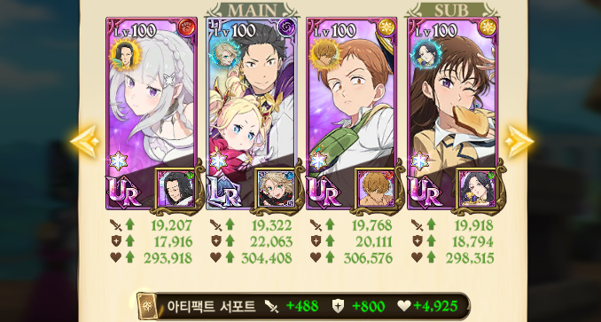 이외에도 '【Re:제로】 쌍둥이 메이드 언니 람 & 동생 렘 (이하 람 or 렘)'과 '【Re:제로】 금서고 사서 베아트리스 (이하 금서고 베아트리스)', 【Re:제로】 탐욕의 마녀 에키드나 (이하 에키드나)'의 능력치 상향이 이뤄졌으며, 람 & 렘과 에키드나는 개성 효과도 한층 보강되면서 일선에서의 활약이 가능(?) 해졌습니다. 3종 영웅에 대한 실제 활용도는 조금 더 실사용해보고 추후 살펴보도록 하겠습니다.