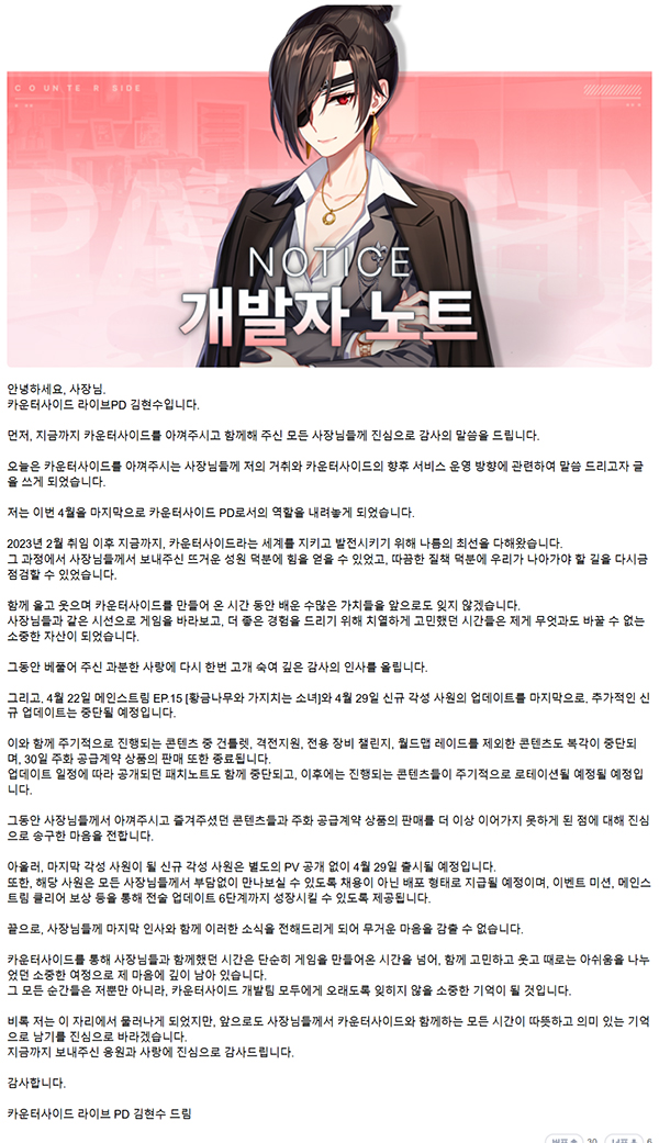 김현수 PD는 소회를 통해 "카운터사이드라는 세계를 가꾸기 위해 치열하게 고민했던 시간들은 소중한 자산이었다"며, 물러나는 자리에서 이용자들에게 감사의 뜻을 전했다.