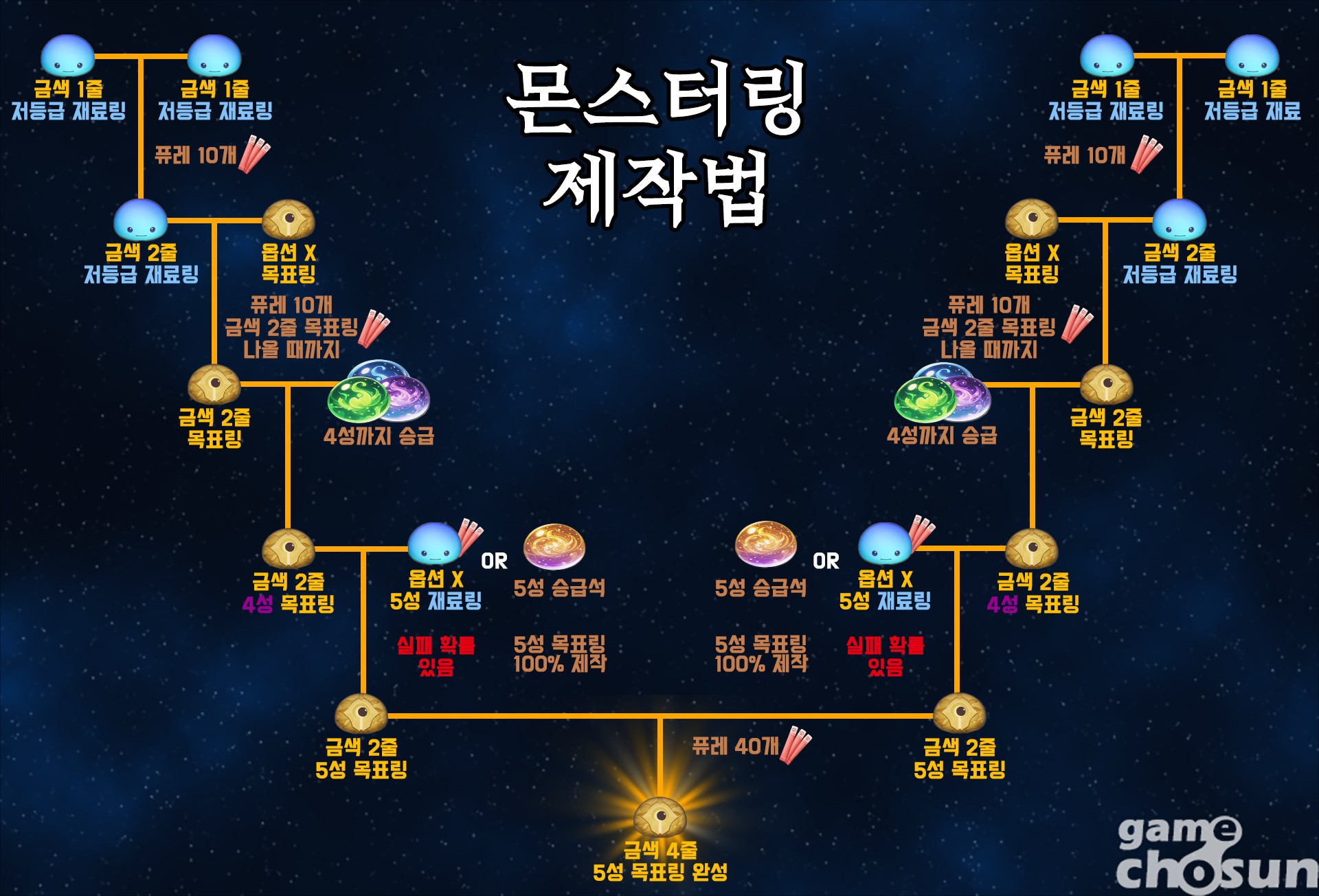 이 경우 성공 확률은 승급 확률 50%와 원하는 몬스터링 등장 확률 50%가 모두 적용된 25%다. 5금색 2줄 5성 몬스터링 제작에 실패했을 경우 대처법은 다음과 같다.