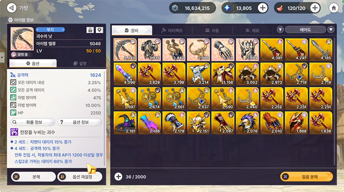 유저들의 요청이 많았던 장비 옵션 관리 시스템도 대폭 개선된다. 새롭게 추가된 장비 옵션 재설정 기능을 통해 무작위로 생성된 옵션을 다시 맞출 수 있게 된다. 이때 신규 아이템인 '변화의 파동' 또는 '왜곡의 파동'이 소모되며, 해당 아이템은 각종 교환소와 콘텐츠 순위 보상을 통해 획득 가능하다.