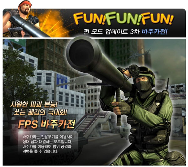 겨울을 맞아 진행되는 콘텐츠 업데이트인 FUN모드는 히든과 좀비탈출이 적용됐으며, 이번에 세 번째로 추가된 바주카전은 양 팀이 오직 바주카포 무기 하나로 대결을 펼쳐 일정 킬포인트를 먼저 달성하는 팀이 승리하는 방식으로 진행된다.