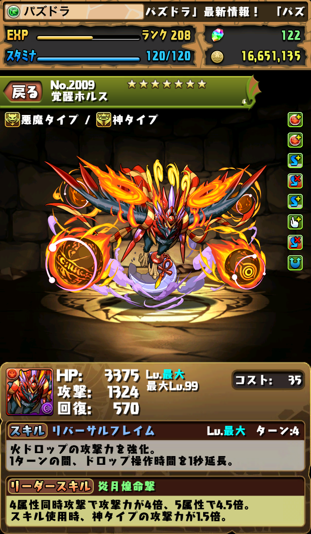 리더스킬: 4속성으로 공격시 공격력이 4배, 5속성에 4.5배. 스킬을 발동했을 때 신타입의 공격력이 1.5배