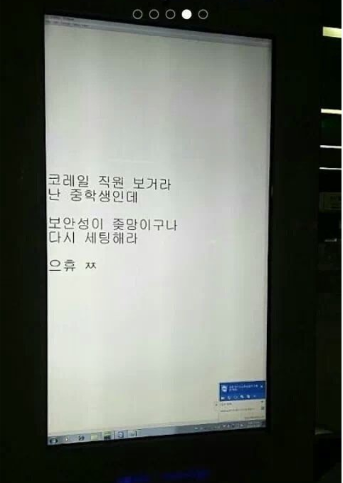 저거 내 기억에는 - 코레일이 관리하는 거 아님 - 터치 스크린이라 누구든 이용 가능 - 작업 표시줄이 노출됨 (이게 문제) - 작업 표시줄로 인터넷들어가서 팀뷰어 같은거 깔거나 특정 페이지 뛰어놓거나 세팅 해버림