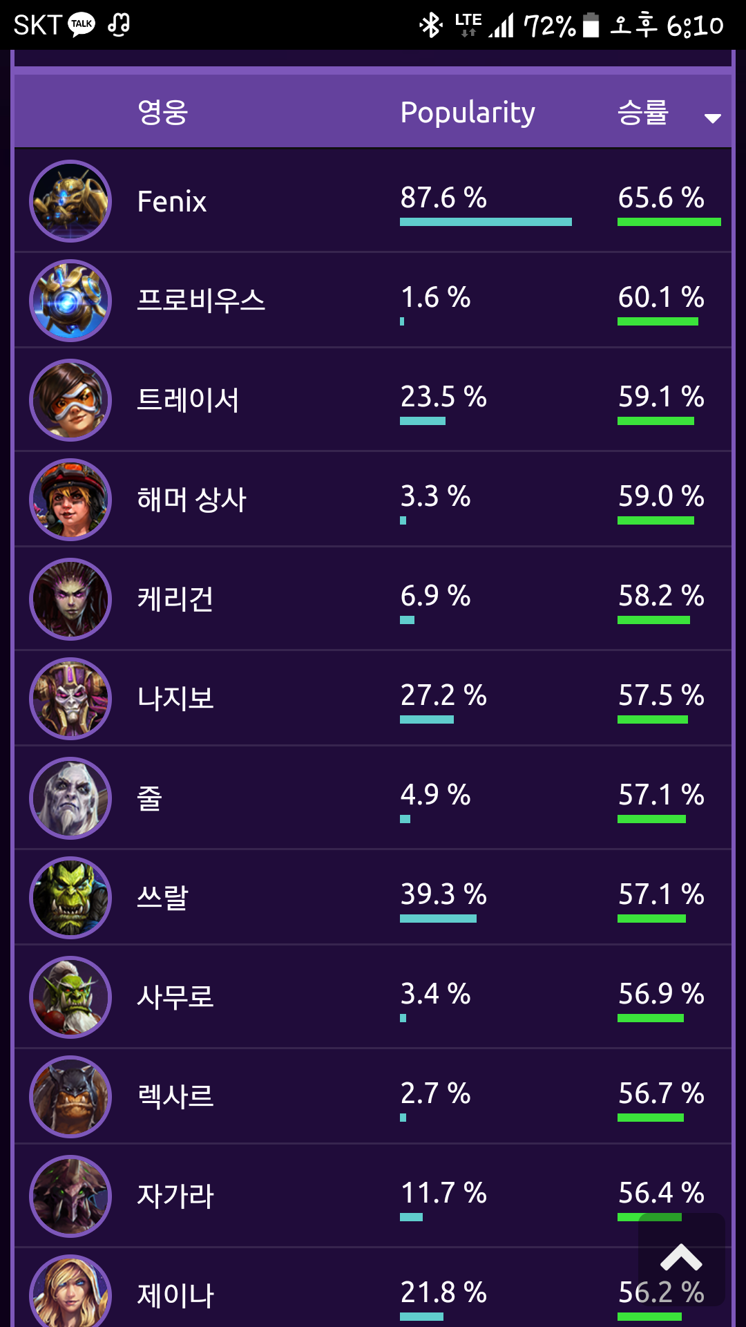프로비우스는 특정맵만 승률 우주 뚫고 워낙 하는 놈이 없는 장인캐릭이라 그럼 픽밴률이랑 승률 둘 다 높은게 좋은 영웅인데 피닉스 제외하면 트레 나지보 스랄정도지