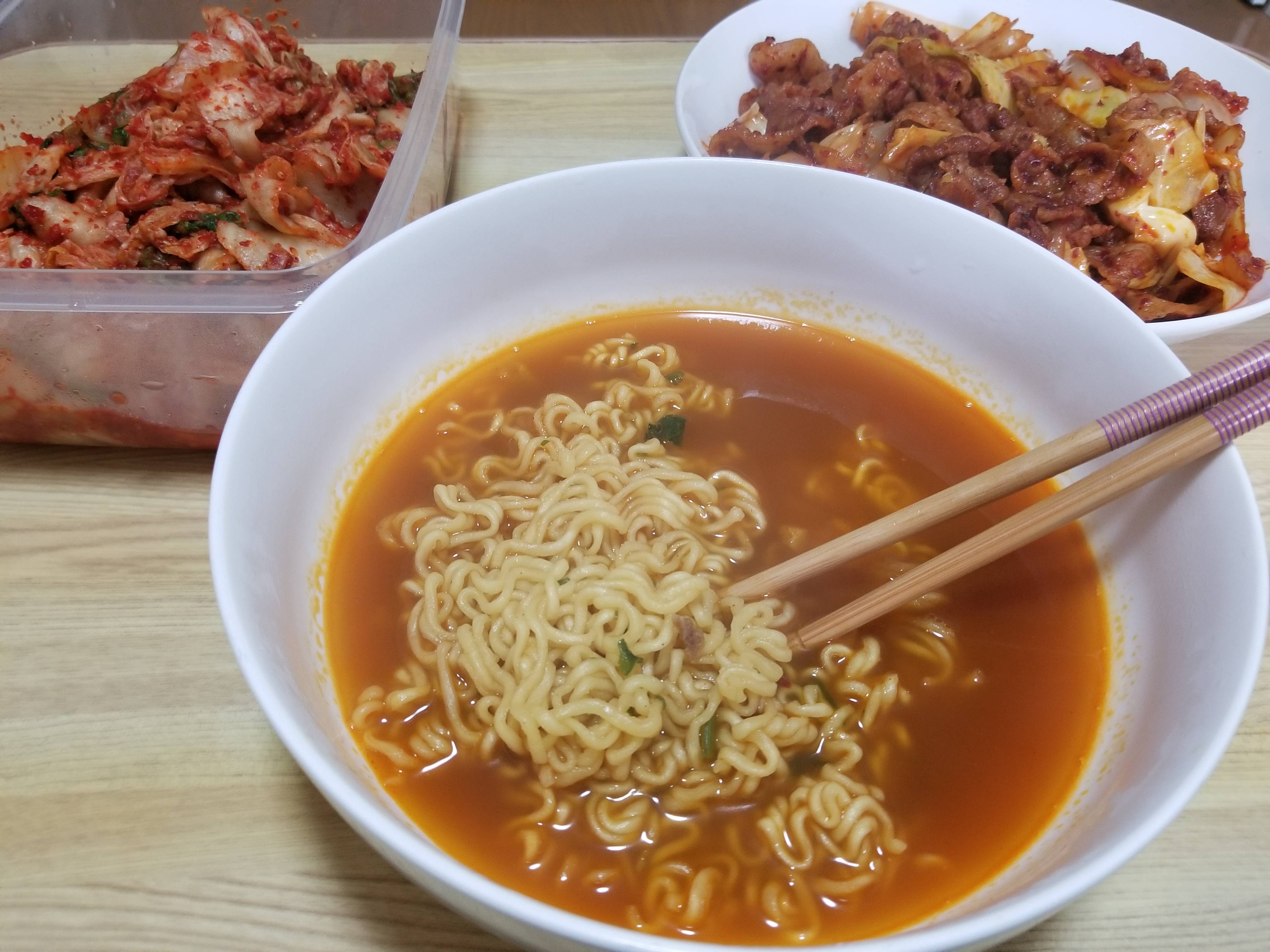 라면에 김치에 제육이라니... 저거 먹으면 물 2리터 바로 원샷떄리것다