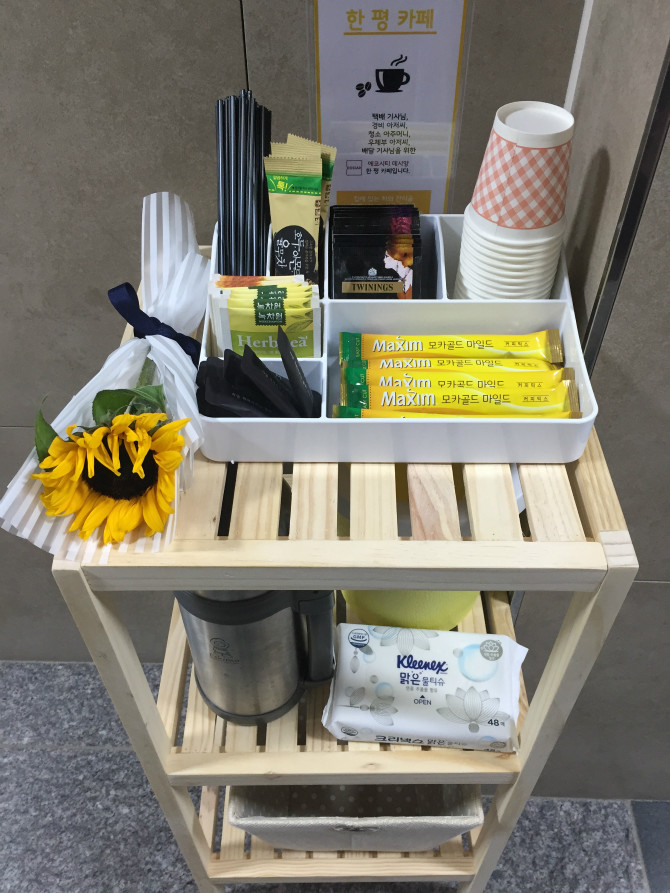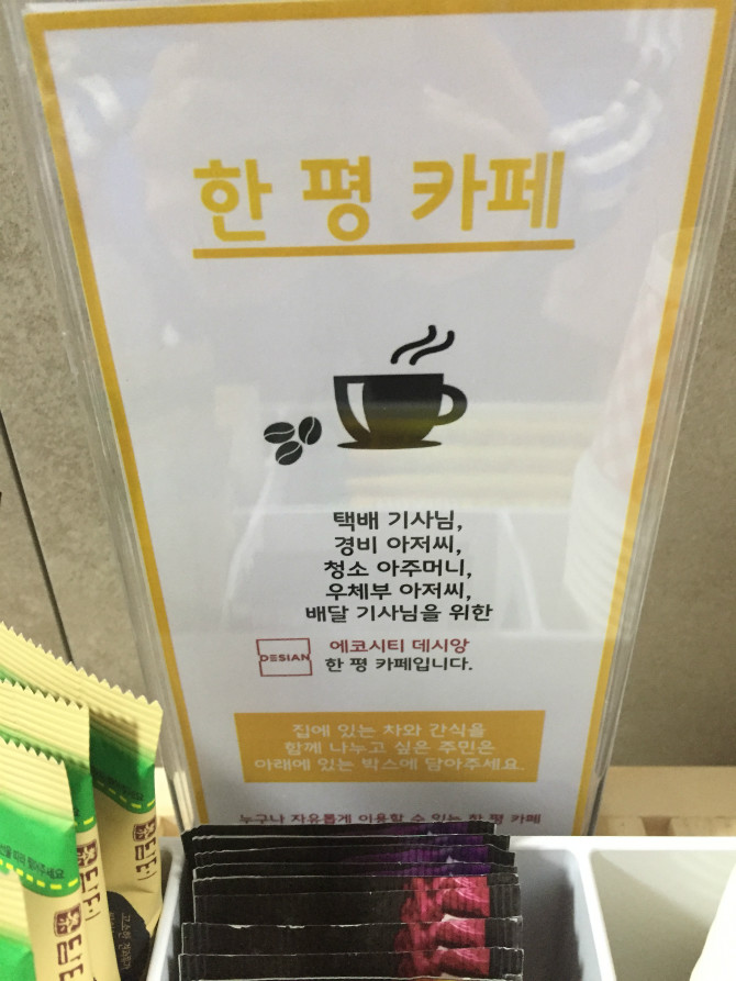 전주 모아파트 1층에 택배 기사님을 비롯한 경비, 청소, 배달부를 위해 한 평 카페를 마련함