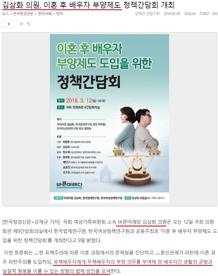 밑줄친 부분에 관련해, 이혼 배우자 부양의무의 법제화가 기존 위자료, 재산분할 관련한 법조항의 수정일지 제 3의 법조항을 만들어서 보호를 강화하자는건지 논의해 보자는게 토론 주제인듯 하고.
