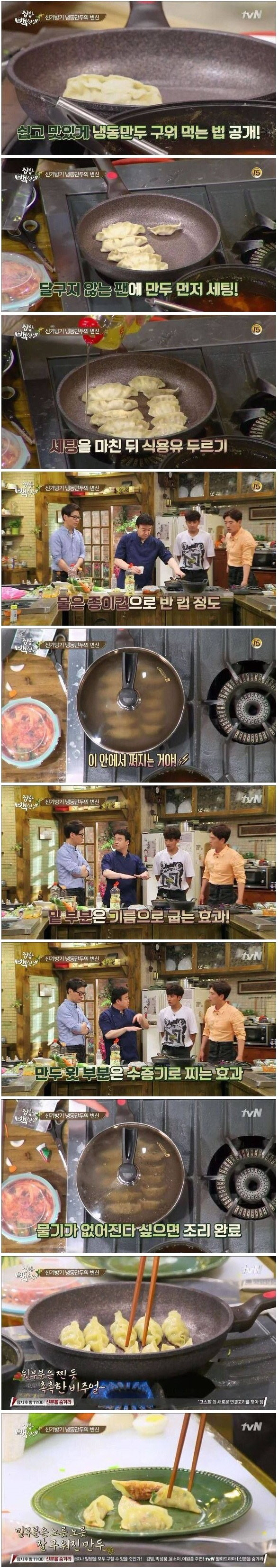 이 조리법의 가장 중요한점이 빠졌네 코팅된 프라이팬이여함 안그러면 눌러붙어서 바삭한게 아니라 밑바닥 터진 만두를 먹게됨 코팅 된 프라이팬이라도 조절잘해야해서 10번하면 3번정도 터짐 꼭 ㅜ ㅜ