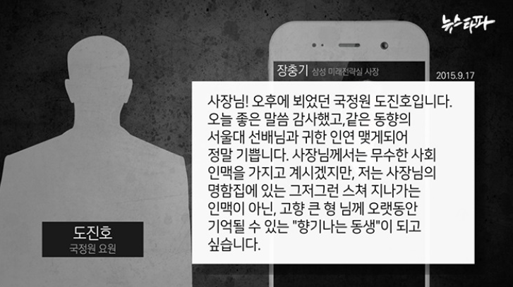 장충기 문자'에 따르면 강민구 현 서울고법 부장판사는 부산지방법원 법원장으로 재직하던 지난 2015년 8월부터 2016년 7월 사이에 총 13건의 문자 메시지를 장충기 전 사장에게 보냈다. 강 부장판사가 보낸 문자는 삼성의 결제시스템인 '삼성 페이'를 홍보했다거나, 법원 내부 사정을 알리는 등의 내용이었다. 판새놈 보소