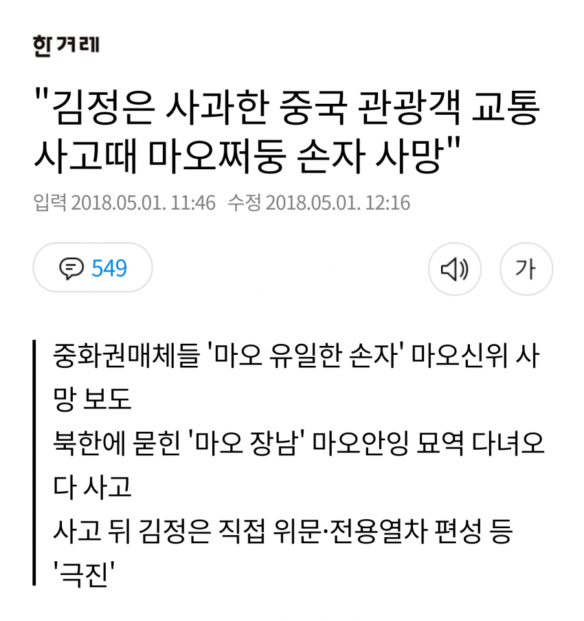 마오쩌둥 손자도 평안남도에서 큰아버지 무덤갔다 오는길에 사망
