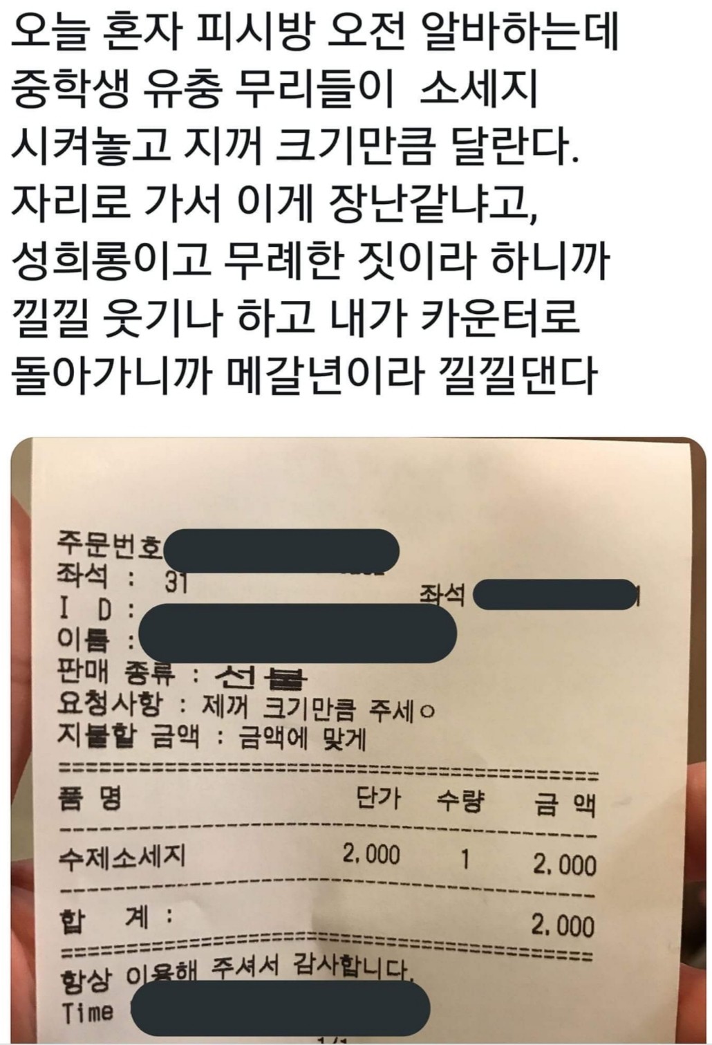 ㅋㅋㅋㅋㅋㅋㅋㅋㅋㅋㅋㅋㅋㅋㅋ시발 지꺼 크기만큼 달라고 했을때 비엔나 소세지 줬으면 유-쾌