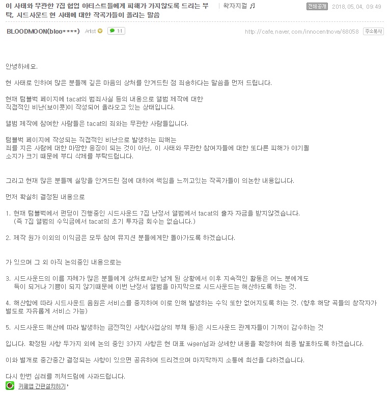 7집 일러로 현재 논란이 되는 나르닥 일러 사용 및 지지 선언,
