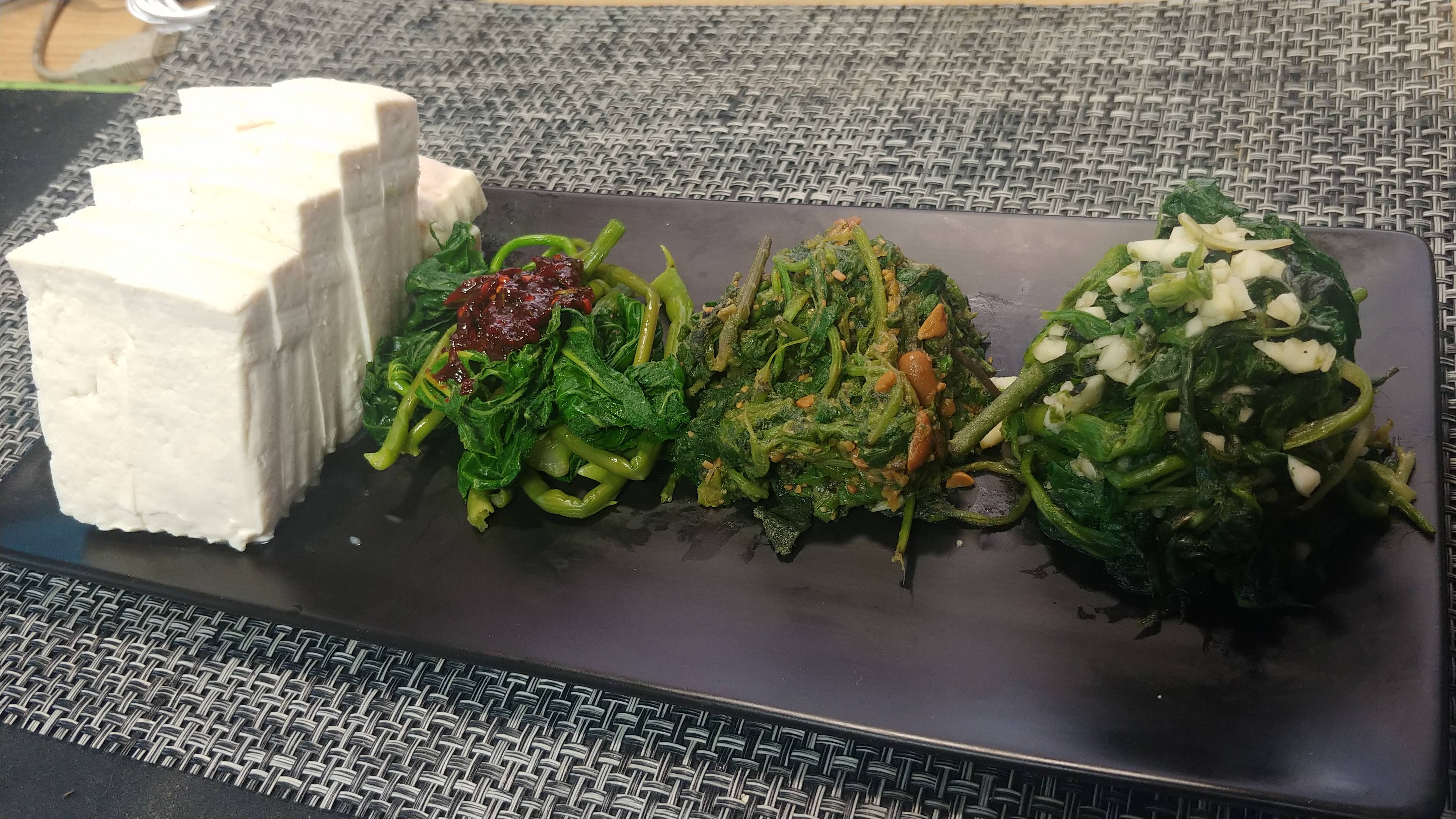 국산콩두부와 세가지 장으로 맛을 낸 나물 그리고 죽순계란조림