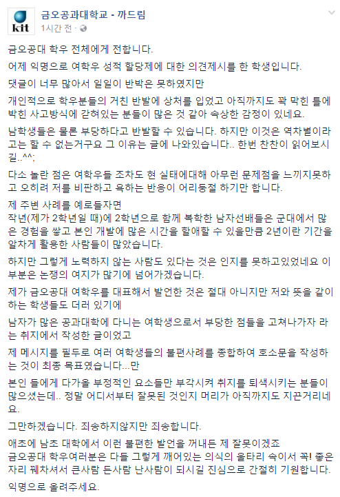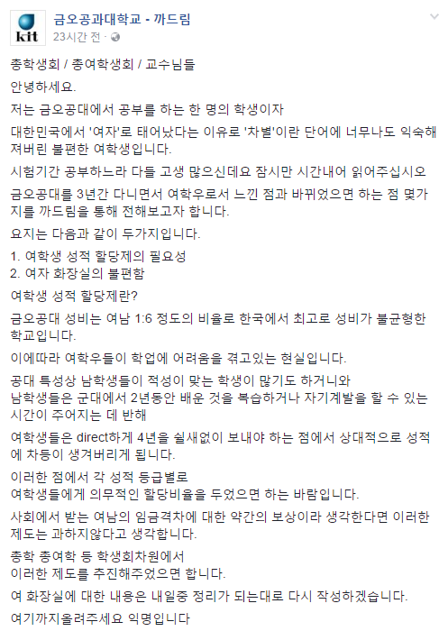 병신같은게 공대특성상 적성에 맞는남성이 많다는걸 아는데 거기에 성적올려달라? 역차별인데ㅋㅋㅋ 지들이 말하는 동등이 현대교육영상에서 남자 조빠지게 해온거 엔빵하는게 동등이라는 수준 잘봤습니다