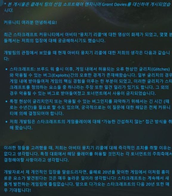 와우로 치면 벽타기는 글리치 벽타고 넘어가서 징치는건 익스플로잇 요는 유저들이 어떻게 활용하냐에 따라 달라질 수 있다는거지 심각하 결함이 아니라면 판단에 기간이 걸릴 수 있다는 의미이고 그동안 주최측에서 자체판단하라는 것 그리고 스타는 저런 글리치가 전략으로 용인되고 주최측에서 허용안되는 것도 있잖아